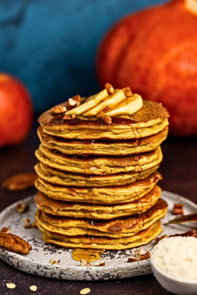 Allow the pumpkin protein powder pancakes to cool completely before storing them in an airtight container. Keep the container in the refrigerator for 3 to 4 days, or freeze for up to 3 months (best quality).